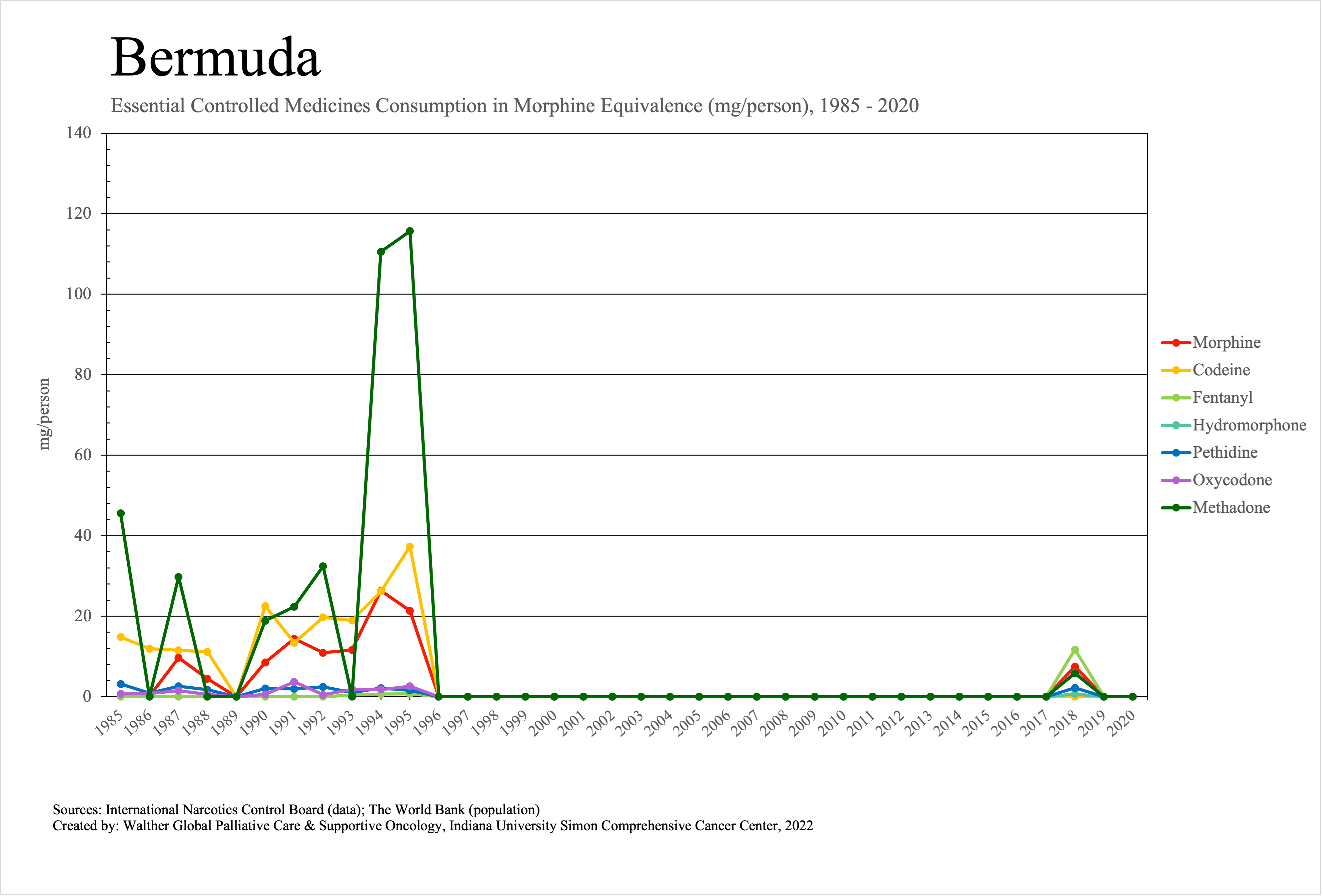 The graphs below provide the Essential Controlled Medicines consumption data trends from 1985 to 2020 in milligrams per capita and Morphine Equivalence (ME) milligrams per capita, as reported to the International Narcotics Control Board (INCB).