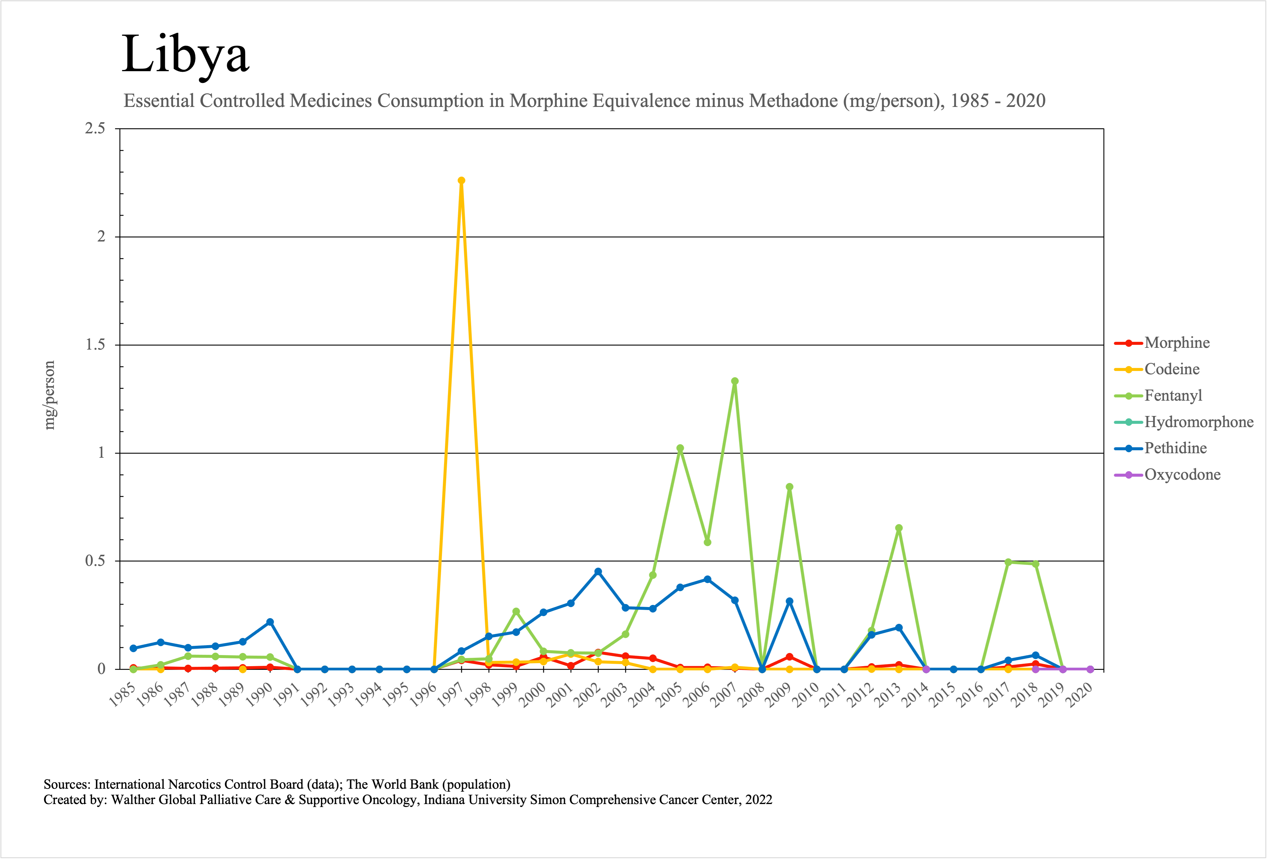 The graphs below provide the Essential Controlled Medicines consumption data trends from 1985 to 2020 in milligrams per capita and Morphine Equivalence (ME) milligrams per capita, as reported to the International Narcotics Control Board (INCB).