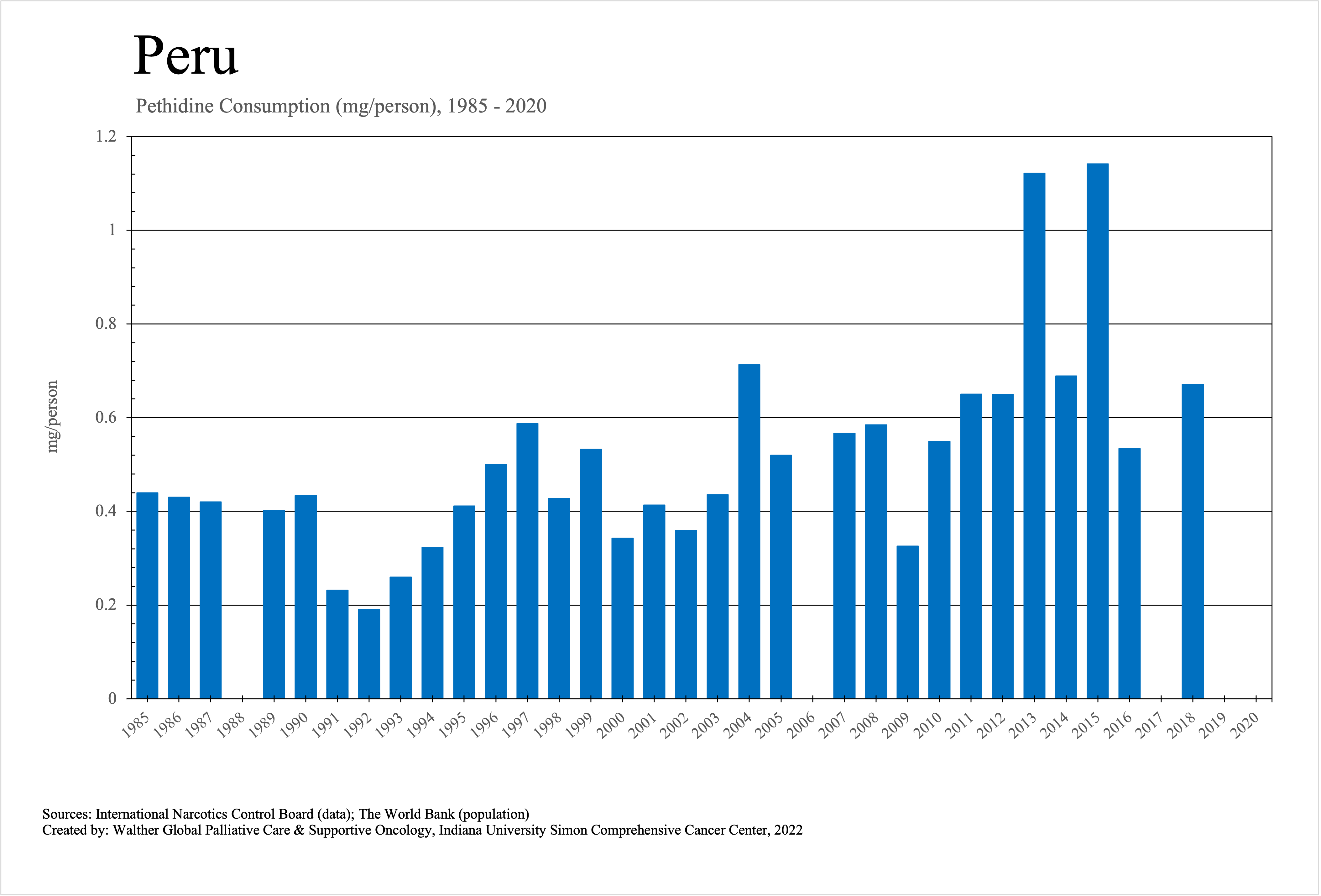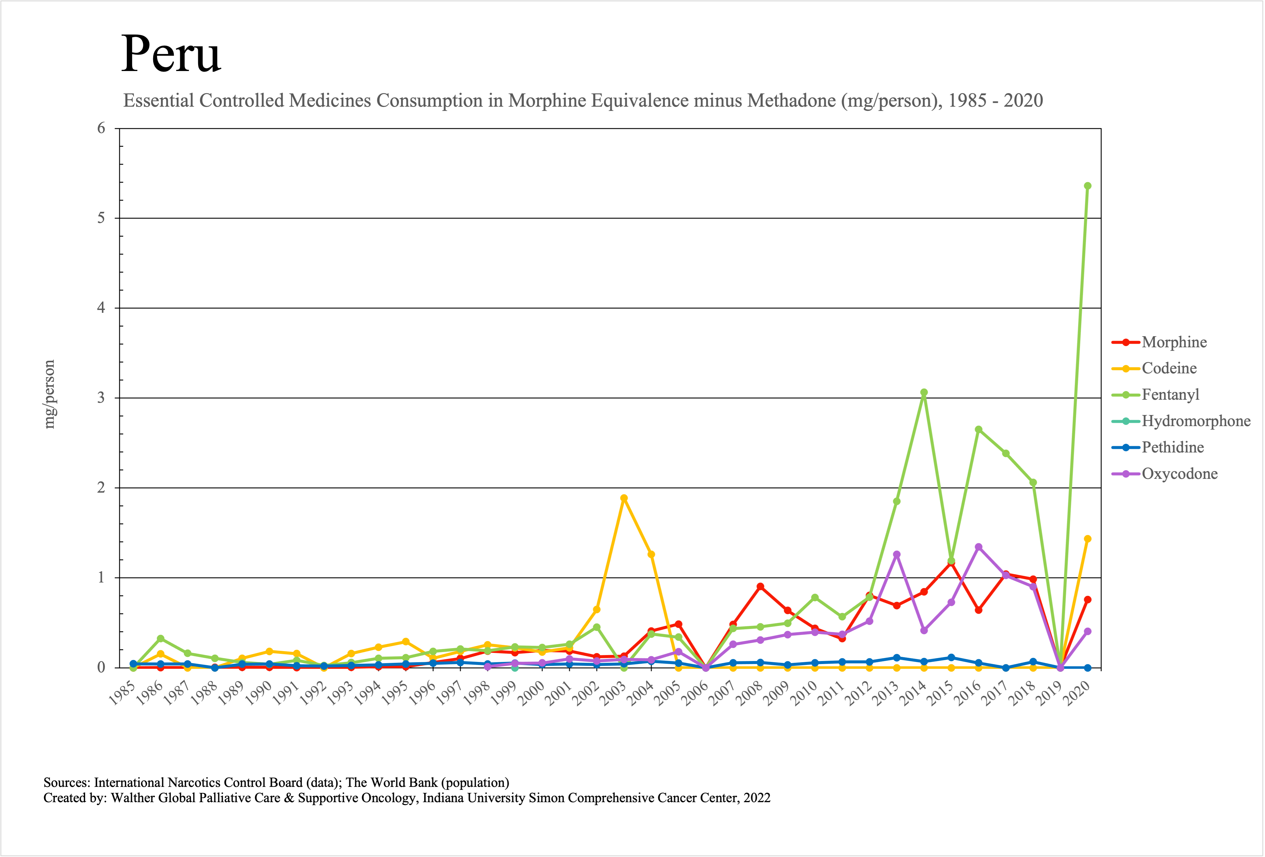 The graphs below provide the Essential Controlled Medicines consumption data trends from 1985 to 2020 in milligrams per capita and Morphine Equivalence (ME) milligrams per capita, as reported to the International Narcotics Control Board (INCB).